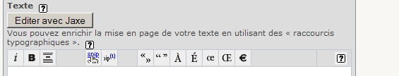 Pour éditer le texte à l’aide d’un éditeur plus convivial, cliquer sur le bouton "Editer avec Jaxe" (attention, une version récente de Java doit être installé sur votre ordinateur, de plus cet éditeur est encore en développement).